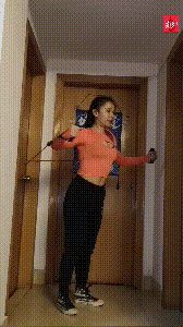 转过身,我们又可以利用弹力绳拉背,这个动作可以有效刺激到下背部。对于女生而言,这个动作可以收缩下背部,就像给背部下部打了阴影,看上去有细腰的效果。